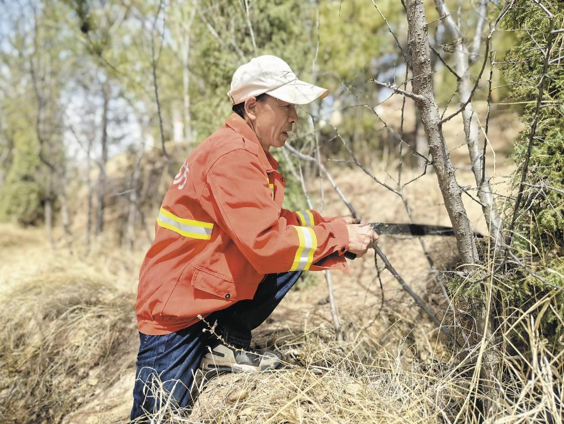 4月9日,初見段國(guó)祿時(shí),他在青海省金融系統(tǒng)大寺溝綠化區(qū)修剪枝條。茂密枝葉的縫隙間,他跪在一棵挺拔的油松前,凝視著層層疊疊、錯(cuò)綜復(fù)雜的枝椏,伴隨著“咔嚓”一聲脆響,枝條應(yīng)聲而斷,從下而上,相互纏繞、阻礙生長(zhǎng)的枝條被一一清理后,原本雜亂無(wú)章的油松仿佛挺直了腰桿。“這些樹就跟孩子一樣,需要精心呵護(hù)才能茁壯成長(zhǎng)。”段國(guó)祿修剪完油松后走向下一棵樹。