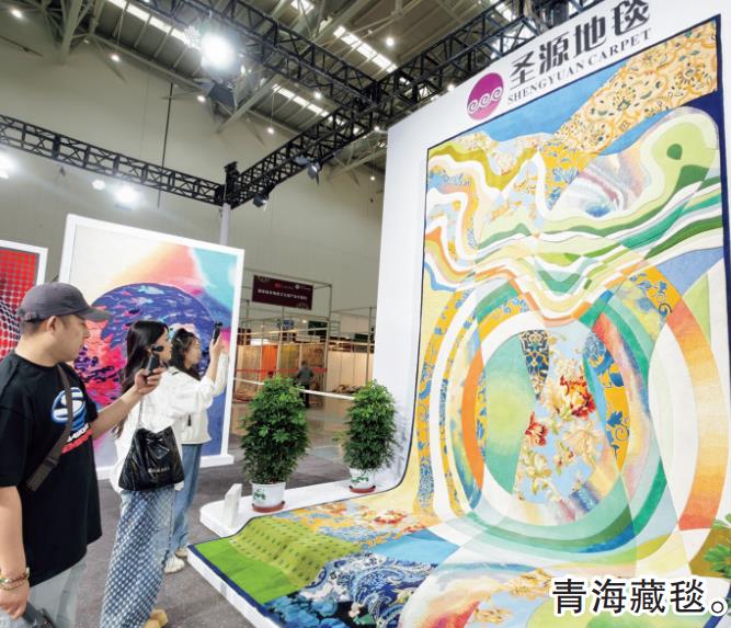 圣源地毯集團有限公司的特裝展位上,一塊塊色彩絢麗的地毯宛如藝術品般陳列。這些地毯既有傳統吉祥圖案的手工毯,又有融入現代設計元素的機織毯。湊近細看,毯面上栩栩如生的花卉圖案層次分明,讓人忍不住想伸手觸摸。