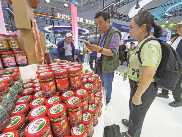展會現場,參展客商和觀展嘉賓絡繹不絕。展品琳瑯滿目,特色好物香味四溢,來往參觀者嘗鮮試吃,贊嘆連連。