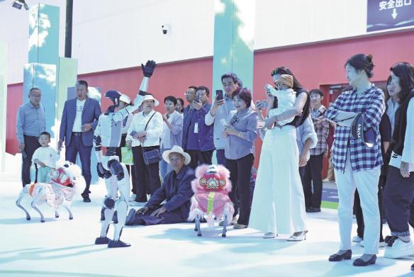綠色算力展區,幾臺機器狗和人形機器人站到了人氣“C位”,被觀眾包圍。機器狗在工作人員操作下做出各種動作,一會兒趴下,一會兒站起,一會兒翻跟頭,引得小朋友們興奮地拉著父母一同觀看。