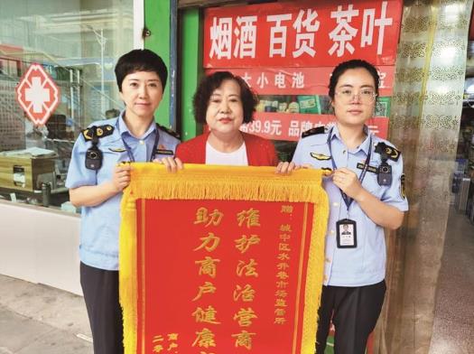 青海新聞網(wǎng)·江源新聞客戶(hù)端訊 7月1日上午,西寧市民主街鑫禧超市內(nèi),店老板賈女士把一面印有“維護(hù)法治營(yíng)商環(huán)境、助力商戶(hù)健康成長(zhǎng)”的錦旗遞到西寧市城中區(qū)市場(chǎng)監(jiān)督管理局水井巷市場(chǎng)監(jiān)督管理所執(zhí)法人員手中,對(duì)執(zhí)法人員柔性執(zhí)法、精準(zhǔn)幫扶指導(dǎo)表達(dá)誠(chéng)摯謝意。