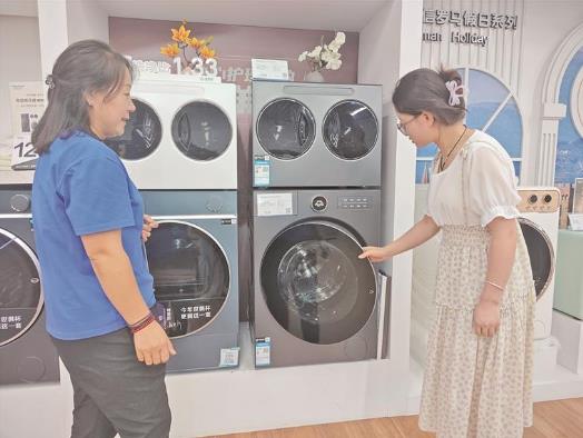 在另一側(cè)展區(qū),顧客周女士正帶母親體驗(yàn)洗衣機(jī)的“離子蒸汽燙洗”程序。“我母親皮膚敏感,這臺(tái)機(jī)器的離子蒸汽燙洗功能,除菌率99.9%,適合老年人,它的一鍵操作功能使用起來(lái)十分便捷。”周女士說(shuō)。而店員補(bǔ)充的“國(guó)補(bǔ)”信息更讓她心動(dòng):“廠商補(bǔ)貼、國(guó)家補(bǔ)貼再加上政府消費(fèi)券補(bǔ)貼,實(shí)在是太劃算了。”
