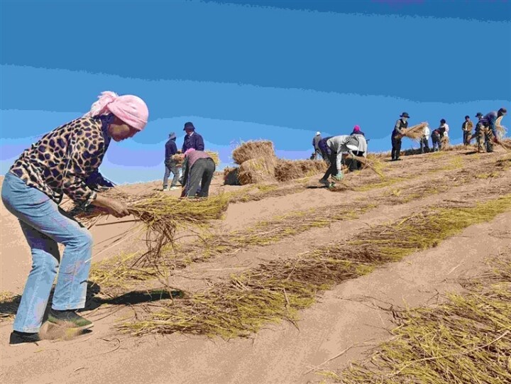 青海新聞網·江源新聞客戶端訊 盛夏時節,海西州都蘭縣夏日哈沙化土地封禁保護區內,暑氣蒸騰。幾十名園林工作者正俯身在滾燙的沙地上忙碌,開溝的鐵鍬起落間揚起細沙,鋪草的雙手在沙壟間穿梭,覆沙的腳步踏過剛成形的網格……一道道工序銜接緊密、井然有序。隨著他們的勞作,成片的草方格在原本荒蕪的荒漠上不斷延展,一條條堅韌的金色鎖鏈,將曾經肆意流動的黃沙牢牢鎖住,在驕陽下勾勒出充滿希望的綠色輪廓。