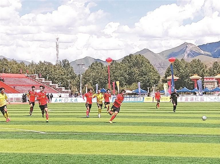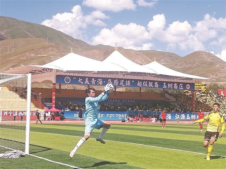上半場第23分鐘,玉樹牦牛隊15號球員尼瑪松寶靈活跑位,在雙方混戰(zhàn)中,在球門附近隨即推射,球進了!全場頓時沸騰,尼瑪松寶興奮地與隊友擁抱慶祝。