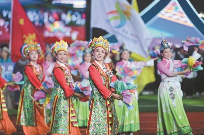 體育是沒有語言的紐帶,競技是心照不宣的共鳴。序章《賽場展雄渾》呈現(xiàn)了賽馬和射箭的精彩,《高原脈動》讓觀眾們感受到籃球的躍動與鍋莊的節(jié)奏共振,歌聲里藏著各族兒女的共同心跳。這脈動,是青春的活力,是協(xié)作的力量,更是“一起向未來”的時代強音。從一開場,人們便深深地感受到這不僅是民族傳統(tǒng)體育的盛會,更是各民族手足相親的聚會,是鑄牢中華民族共同體意識的生動注腳——每一項競技都鐫刻著“共同團結(jié)奮斗”的印記,每一次喝彩都傳遞著“共同繁榮發(fā)展”的心聲。
