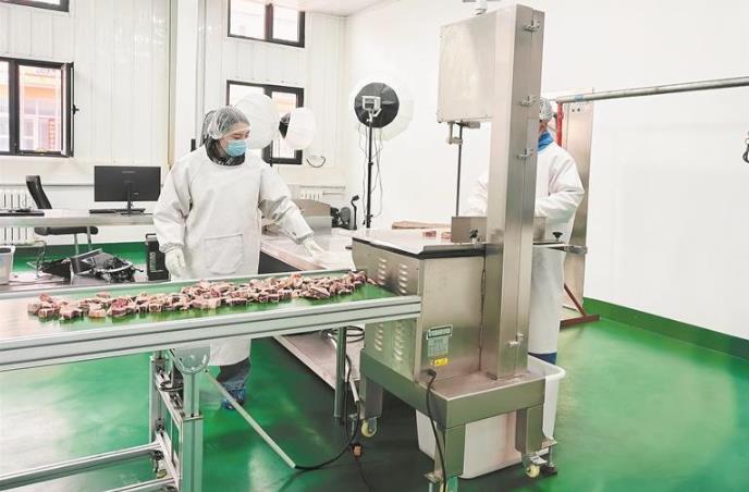 剛察立足資源稟賦,推動畜牧業由“原”字號向精深加工跨越。在位于剛察縣沙柳河鎮果洛藏貢麻村的海北剛察貢洛農畜產品開發有限責任公司,透過車間玻璃,技術員達日杰忙著在機器前,精細化切割牦牛肉。