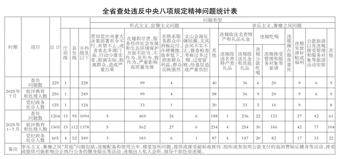 7月,全省查處違反中央八項規(guī)定精神問題229起,批評教育和處理250人,給予黨紀政務(wù)處分125人。其中,查處形式主義、官僚主義問題143起,批評教育和處理161人,給予黨紀政務(wù)處分54人;查處享樂主義、奢靡之風(fēng)問題86起,批評教育和處理89人,給予黨紀政務(wù)處分71人。
