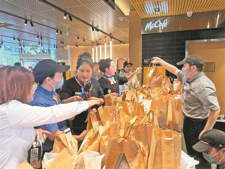 麥當勞店內工作人員正緊張有序地打包餐品,堆滿桌面的紙袋彰顯出開業首日的火爆消費需求。